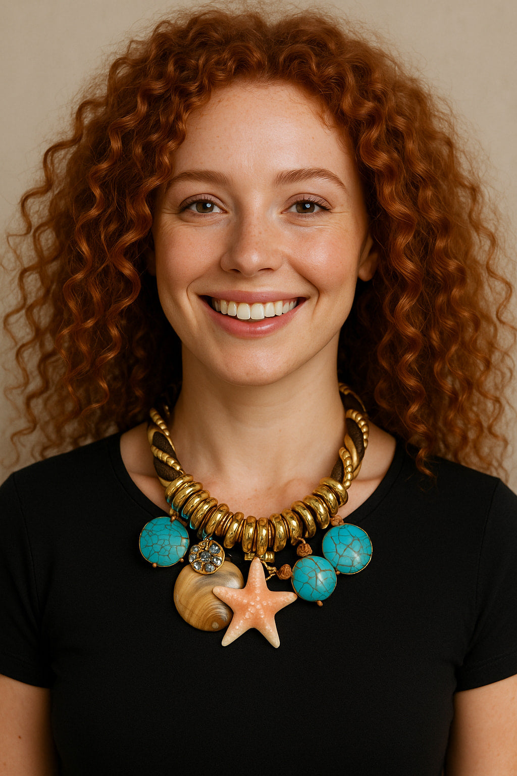 Ένα εντυπωσιακό πανέμορφο κομμάτι με σταθερό και ποικιλόμορφο περιλαίμιο και απίθανα κρεμαστά θαλασσινά στοιχεία (αστερίας, κοχύλι, κλπ)