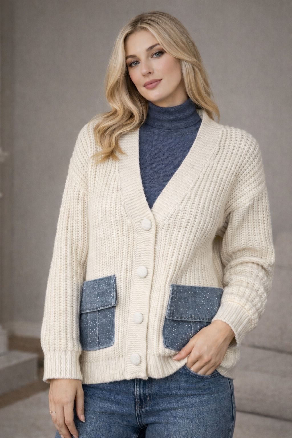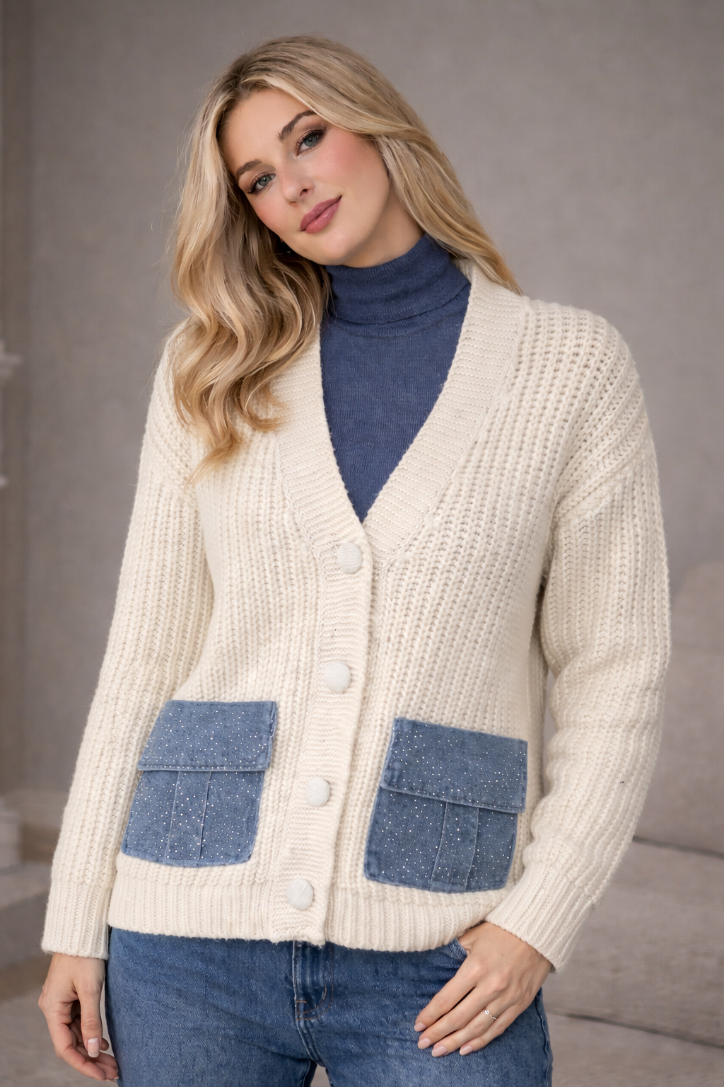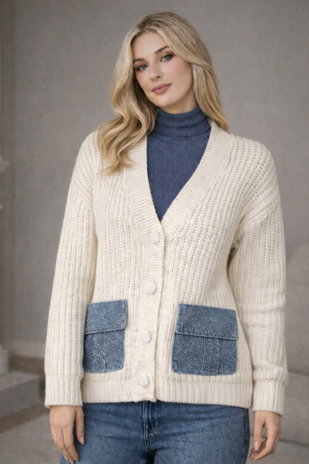 Ζακέτα ζεστή, απαλή, με όγκο, παχιά πλέξη, με κουμπιά επενδεδυμένα με πλεκτό, με Jean τσέπες με καπάκι και strass (χρησιμοποιούνται κανονικά)