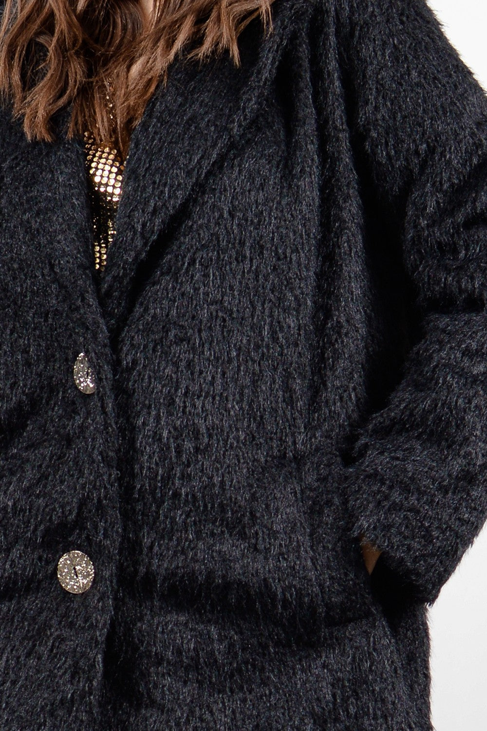 Διαθέτει μεγάλο κλασικό γιακά και κλείνει με δύο μεγάλα σφυρήλατα χρυσαφί κουμπιά στο μπροστινό μέρος