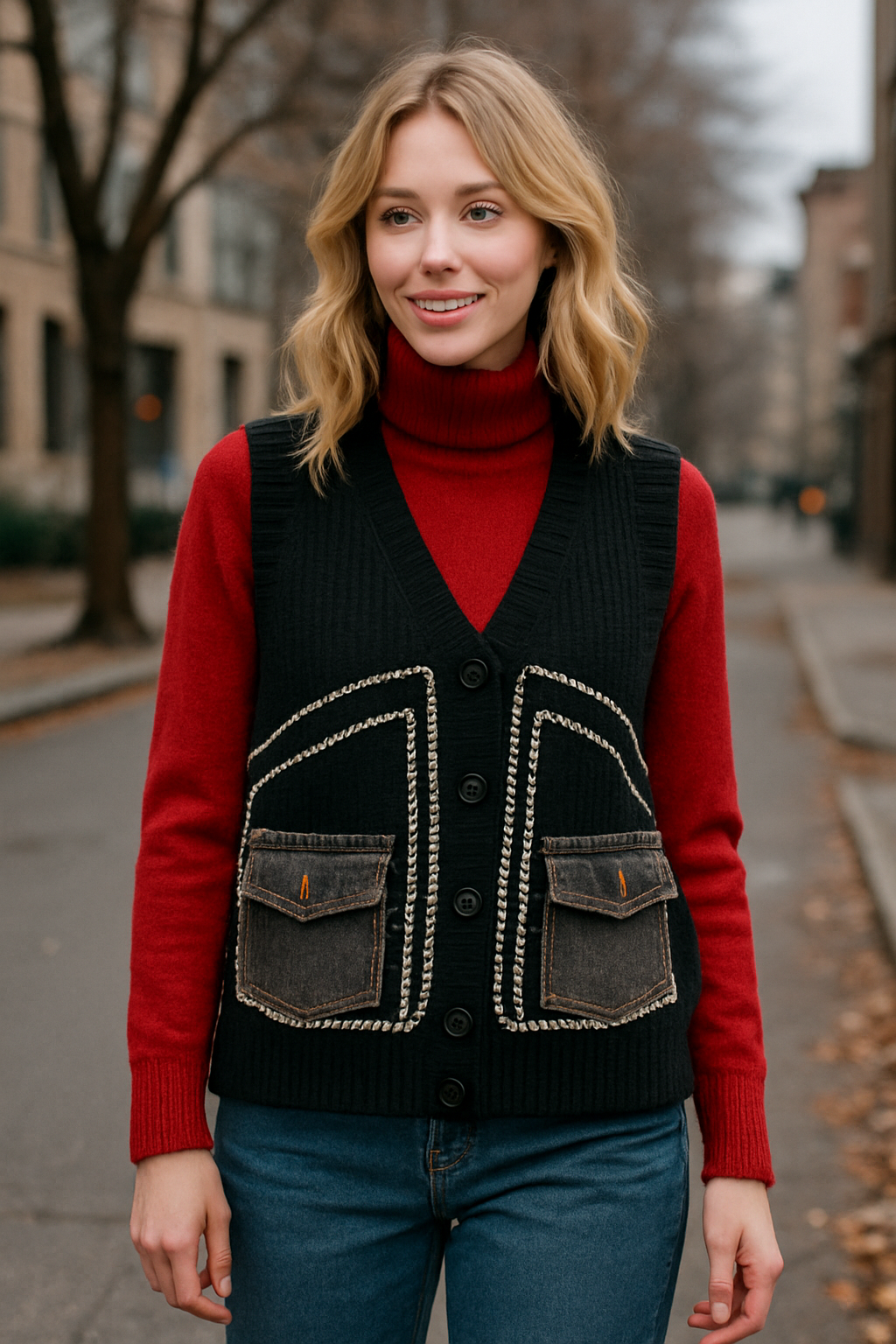 Γιλέκο oversized πλεκτό με jean λεπτομέρειες