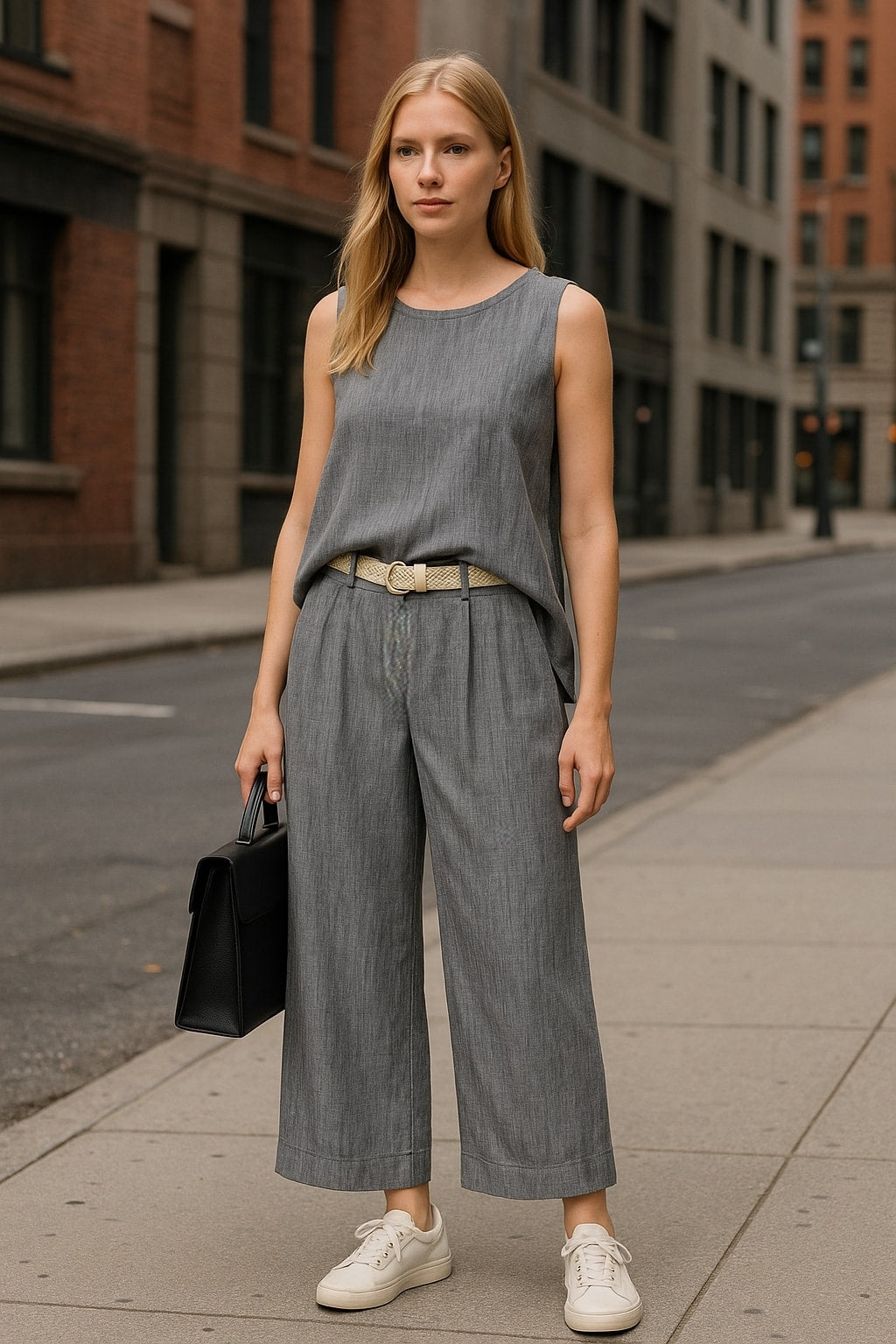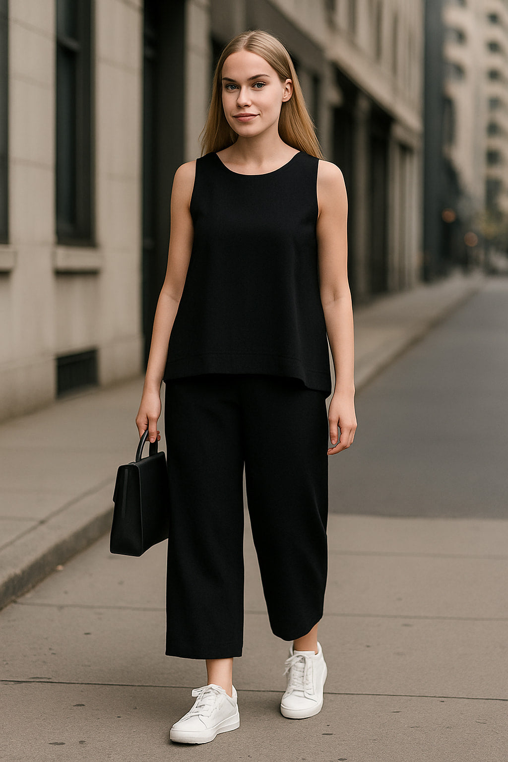 Μπλούζα αμάνικη, σε Α άνετη γραμμή, με ανοίγματα στο πλάι και σχεδιαστική λεπτομέρεια πριν το τελείωμά της, καλύπτει άνετα την κοιλιά